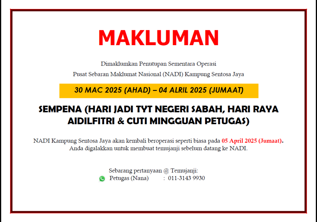 Dimaklumkan bahawa Mini NADI Kampung Sentosa Jaya akan ditutup sementara bermula 30 Mac 2025 (Ahad) hingga 4 April 2025 (Jumaat) sempena: