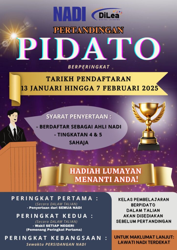 Anda berbakat dalam seni pidato? Atau ingin mencabar diri anda untuk berucap di hadapan khalayak ramai? Sertai Pertandingan Pidato NADI 2025 yang diadakan secara berperingkat bagi peserta tahap menengah atas (Tingkatan 4 & 5 / 2025) dan buktikan kemampuan anda!